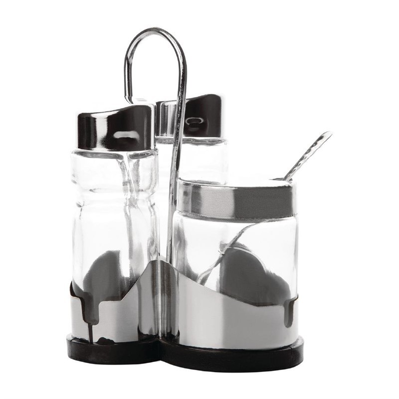 | Overige Kenmerken | Inclusief zout- en peperstrooier en mosterdpotje, Set van 3, Roestvrijstalen houder met zwarte, kunststof voet, |
