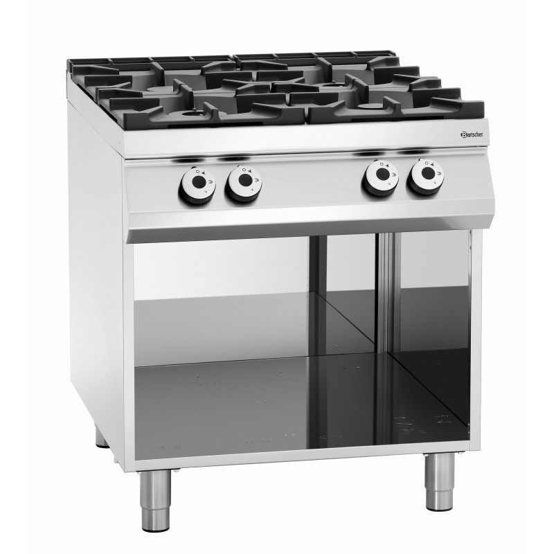 Serie 900 Master CNS 18/10 Met open onderbouw Afmetingen: B 800 x D 900 x H 900-950 mm Vermogen: 24,5 kW gas 4 branders: 1 x 3,5 kW, 1 x 5 kW, 2 x 8 kW Eenvoudig reinigen: - branderhouder met uitneembare opvangschaal Gasfornuis met waakvlam welke afgeschermd en twee kruisbranders.