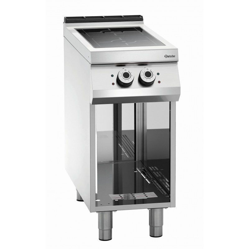 Serie 900 Master Met open onderbouw Afmetingen: B 400 x D 900 x H 900-950 mm Vermogen: 10 kW / 400 V 50/60 Hz 3 NAC Glasplaat: 320 x 650 mm, 2 x 5 kW Inductiespiralen: Ø 270 mm