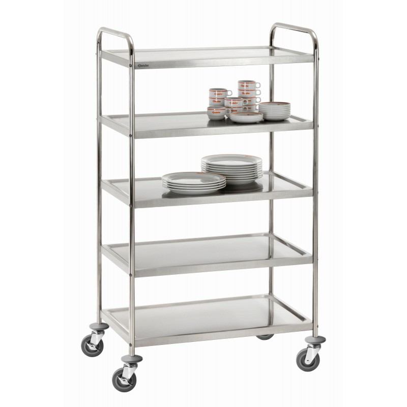 Robuust en veelzijdig, of u hem nu gebruikt voor transport in de gastronomie of voor het verzamelen van de vaat in hotels, enz. Met de 5 leggers biedt de serveerwagen extreem veel berg- en afzetruimte.