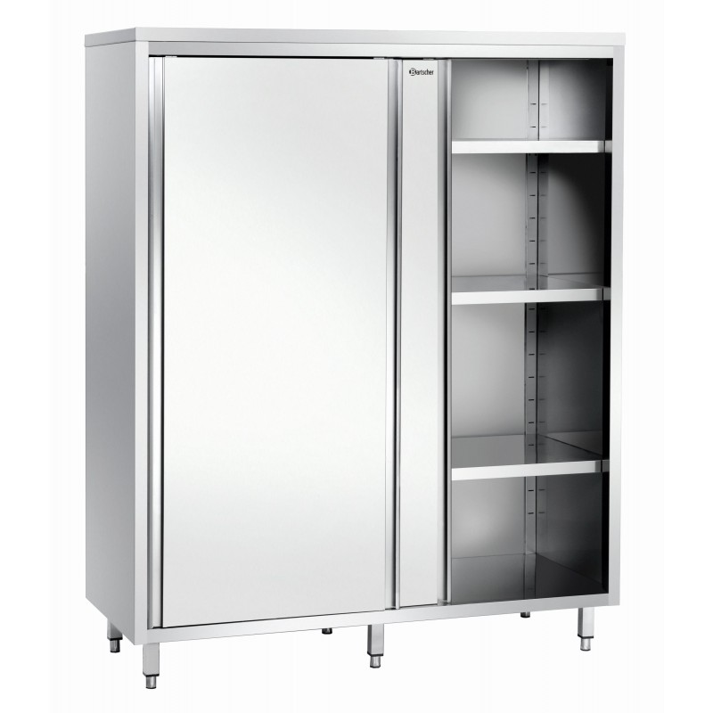 RVS Vierkante poten, buisvormig, 40 x 40 mm, tot 50 mm in hoogte verstelbaar Legplanken met omgebogen randen van 40 mm breed De draagplanken zijn voorzien van een dwarwbalk voor extra draagkracht. Met 2 schuifdeuren Afmetingen: B 1200 x D 600 x H 2000 mm Op verzoek andere maatvoeringen leverbaar!