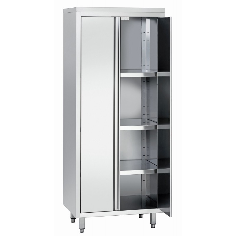 RVS Vierkante poten, buisvormig, 40 x 40 mm, tot 50 mm in hoogte verstelbaar Legplanken met omgebogen randen van 40 mm breed De draagplanken zijn voorzien van een dwarwbalk voor extra draagkracht. Met 2 zwaaideuren Afmetingen: B 800 x D 600 x H 2000 mm Op verzoek andere maatvoeringen leverbaar!