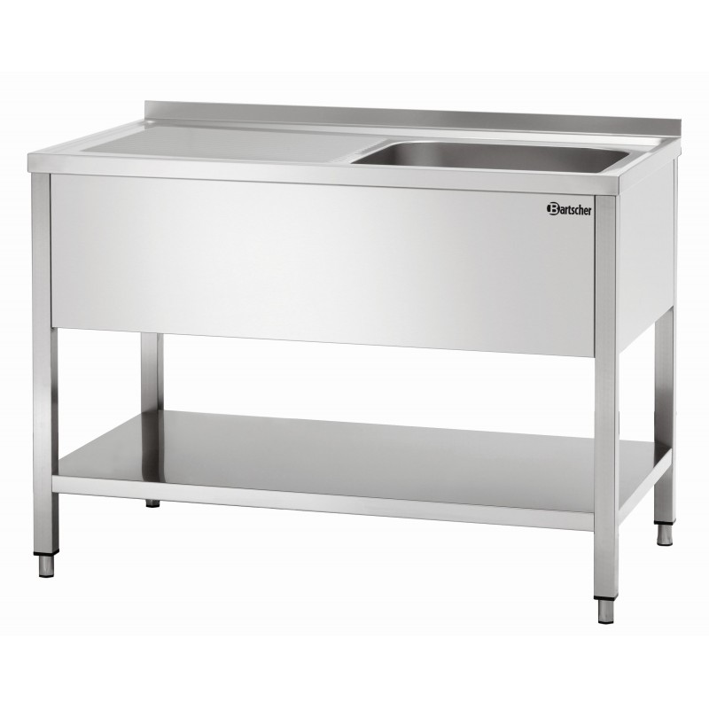 Afdruipvlak links Diepte 700 mm, RVS Scotch-Brite gepolijst, 40 mm afgerond Vierkante poten, buisvormig, 40 x 40 mm tot 50 mm in hoogte verstelbaar Voorzien van een waterkering van 40 mm hoog Afmetingen spoelbak: B 500 x D 500 x H 250 mm Afmetingen: B 1200 x D 700 x H 850-900 mm