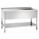 Afdruipvlak links Diepte 700 mm, RVS Scotch-Brite gepolijst, 40 mm afgerond Vierkante poten, buisvormig, 40 x 40 mm tot 50 mm in hoogte verstelbaar Voorzien van een waterkering van 40 mm hoog Afmetingen spoelbak: B 500 x D 500 x H 250 mm Afmetingen: B 1400 x D 700 x H 850-900 mm