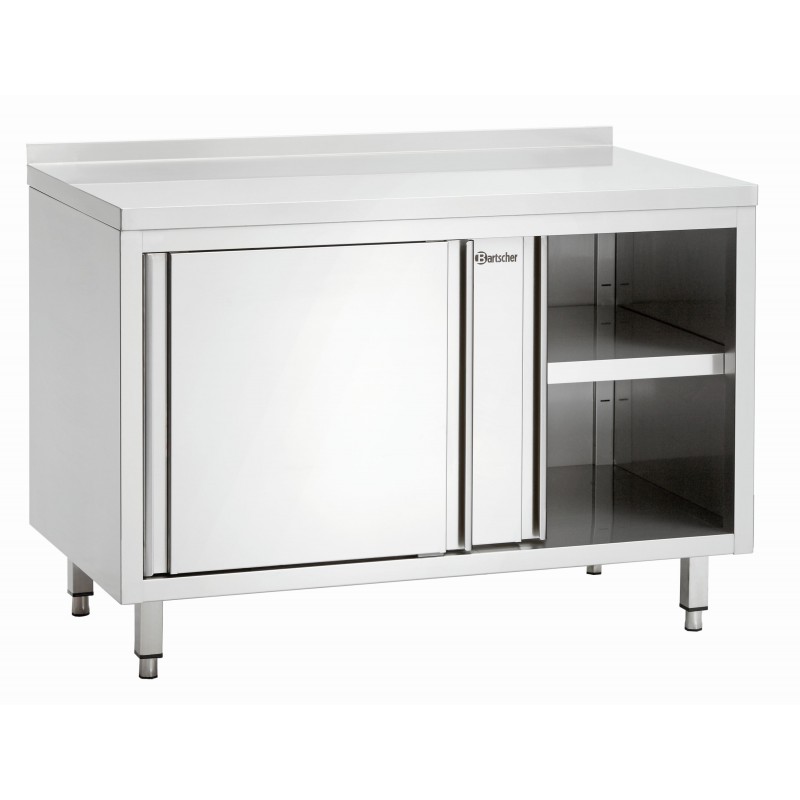 RVS Scotch-Brite gepolijst 40 mm afgerond met schuifdeuren In hoogte verstelbare legplank Vierkante poten, buisvormig, 40 x 40 mm, tot 50 mm in hoogte verstelbaar 40 mm achteropstand Afmetingen: B 1200 x D 700 x H 850-900 mm Op verzoek andere maatvoeringen leverbaar!