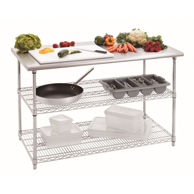 Versterkt werkblad van RVS, ca. 250 kg belasting mogelijk. Onderliggende draagroosters zijn van speciaal gecoat staal. Hoogte van de roosters is zelf in te stellen. De roosters hebben per stuk een draagvermogen tot maximaal 150 kg. Voeten hoogteverstelbaar Eenvoudige montage! B 1300 x D 690 x H 880-900 mm Prijs is exclusief accessoires!
