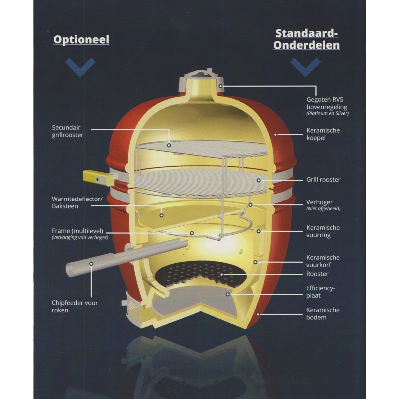 De Saffire grills in de Silver-categorie bevatten een aantal hoogwaardige onderdelen, waaraan geen enkele andere Kamado-grill kan tippen. Ze zijn voorzien van een 2.5 cm (1 inch) dikke keramische laag en extra robuust beslag. Alle regelkleppen zijn gemaakt van strakgepolijst 304* RVS en is het summum van schoonheid, roestvastheid, stevigheid en duurzaamheid.