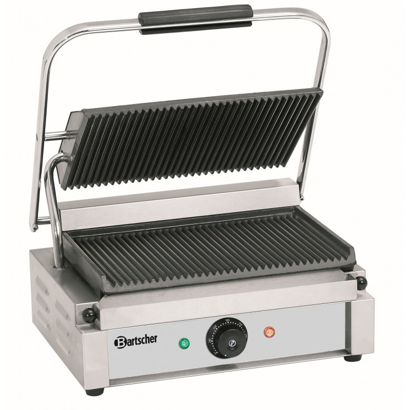 groot grill-vlak in geribbelde uitvoering Robuust apparaat van CNS Grillplaten van gietijzer voor optimale warmteoverdracht Regelbare thermostaat: 50 ºC tot 300 ºC Voorverwarmings controle lampje Controle lampje in/buiten bedrijf Vetopvangschaal B 410 x D 370 x H 200 mm Bovenste grillplaat: B 335 x D 220 mm Onderste grillplaat: B 335 x D 230 mm Vermogen: 2,2 kW / 230 V 50/60 Hz Levering inclusief reinigingsborstel