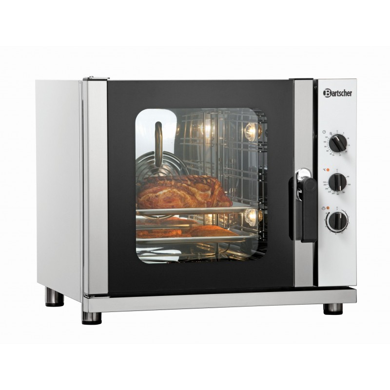 Materiaal: RVS interieur en exterieur Binnenverlichting Deur met dubbele beglazing 180 ° openende deur - voor meer vrije ruimte Afgeronde hygienische hoeken in de oven kamer Wisselende motorrichting (rechts-/linksom draaiend) voor een optimaal klimaat in de gaarruimte Temperatuurschakelaar: 0 °C tot 280 °C Tijdschakelaar: 0 - 120 Minuten Capaciteit: 5 x 2/3 GN Roosterafstand: 70 mm Wateraansluiting 3/4" Vermogen: 4,3 kW / 400 V 50-60 Hz 3 NAC Afmetingen: B 700 x D 750 x H 625 mm Levering inclusief 2 bakblikken 2/3 GN