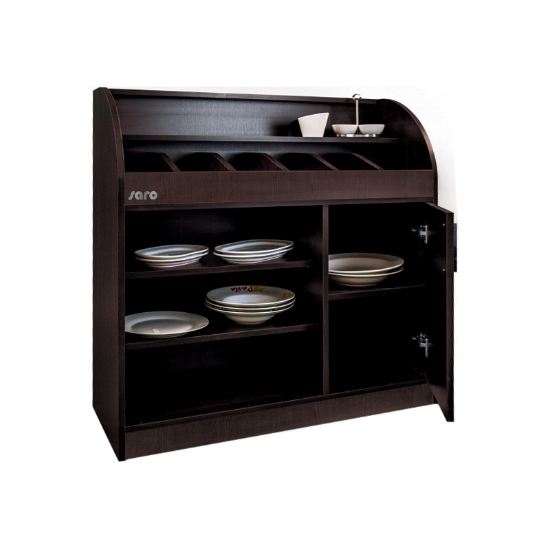 • Materiaal: hout (fineer) • Kleur: wenge • Deur met soft-close functie • Bovenste plank: W 960 x D 90 mm • Plank boven vakken: B 960 x D 170 mm • 6 compartimenten: W 145 x D 360 x H 80 mm • Compartimenten met 2 planken: W 570 x D 315 mm • Gesloten compartiment met deur en schap: W 365 x D 360 x H 585 mm • Levering samengesteld, zonder decoratie