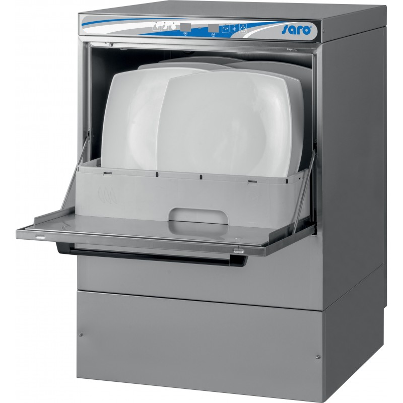 • Materiaal: (behuizing en wasarm) roestvrij staal • Elektronische controle met 3 programma's • Zelfdiagnostisch systeem • Dubbelwandige deur, hoogte 360 mm • 1 glazen mandje inbegrepen, W 500 x D 500 x H 100 mm • 1 bestekmandje inbegrepen, W 110 x D 110 x H 130 mm • 1 plaatlade inclusief, W 500 x D 500 x H 100 mm • Drukreductie • Peristaltische wasmiddel en spoelpomp, afvoerpomp en vuilfilter • Max. plaat hoogte: ca. 335 mm • Max. glazen hoogte: ca. 325 mm • Cyclus: 60/120/180 Seconden • Ketel: capaciteit 6 liter, verwarmingselement: 3,0 kW • Tank: capaciteit 35 liter, verwarmingselement: 2,8 kW