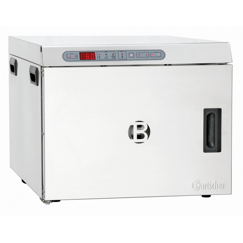 Materiaal: edelstaal Deur met magneetsluiting Openingszijde deur verwisselbaar Draaggrepen - zijdelings 2 stuks Gaarruimte met afgeronde hoeken Inschuifplaten: 3 x (1/1 GN of 600 x 400 mm, tot 65 mm diep) Uitneembare draagrails, voor reinigingsgemak Afstand tussen de platen 80 mm Kerntemperatuursensor Temperatuurbereik: 30 °C tot 110°C Digitaal bedieningspaneel COOK-functie - voor garen bij lage temperaturen tot max. 110 °C HOLD-functie - voor instelling van de exacte warmhoudtemperatuur Vermogen: 1,2 kW / 230 V 50 Hz Afmetingen: B 505 x D 715 x H 415 mm Inclusief: 1 paar oplegrails geschikt voor 600 x 400 ovenplaten