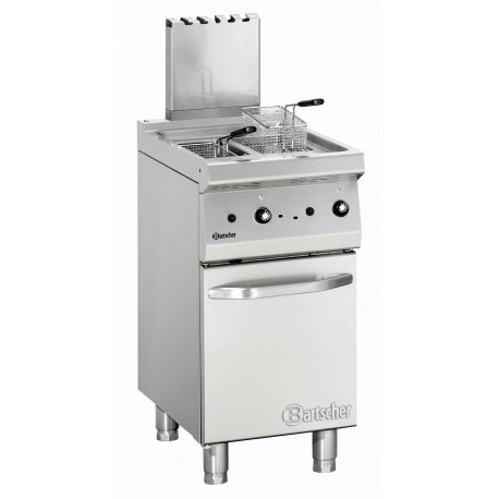 CNS 18/10 Afmetingen: B 400 x D 700 x H 850-900 mm Vermogen: 11,5 kW gas Inhoud binnenpan: 2 x 7 liter 2 Frituurmanden: B 110 x D 255 x H 110 mm met vetopvangbak