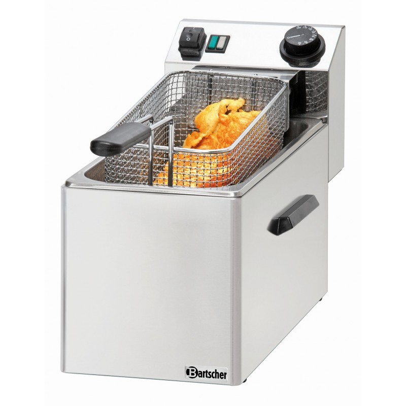 Extra lange uitvoering Geschikt voor bereiding van lange produkten, zoals bijv. vis. Behuizing, deksel en schakelpaneel van CNS 1 binnenpan, 1 frituurmand Inhoud: 8 liter Mandmaat: B 150 x D 320 x H 120 mm Roestvrij stalen verwarmingselementen Koudezone Veiligheidsthermostaat (beveiliging tegen oververhitting) Vermogen: 3,4 kW / 230 V 50 Hz Afmetingen: B 240 x D 590 x H 320 mm