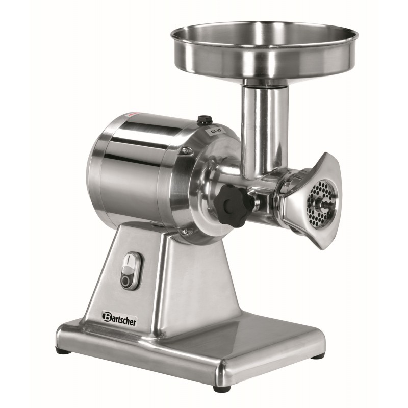 Behuizing aluminium, trechter van CNS 18/10 Materiaal aandrijving: staal Gemakkelijke schoon te maken omdat alle onderdelen demontabel zijn Inclusief 1 mes, 1 schijf met perforaties van 6 mm Diameter geperforeerde schijven: 70 mm Productie-capaciteit per uur: 160 kg Vermogen: 0,75 kW / 230 V 50 Hz Afmetingen: B 290 x D 460 x H 500 mm