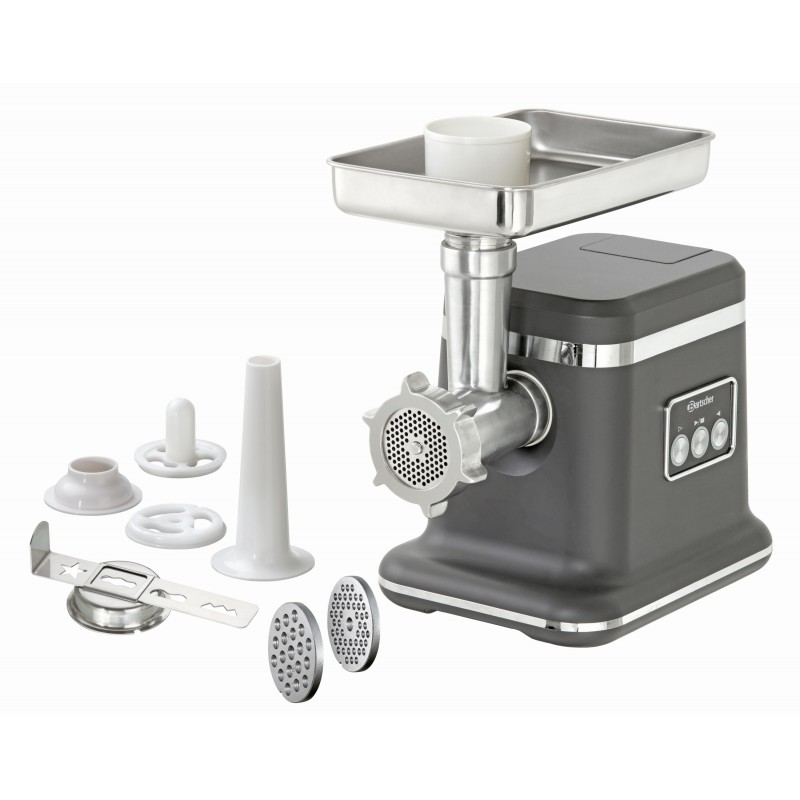 Of het nu gaat om gehakt, paté of broodbeleg met de uitgebreide hulpstukken is de vleesmolen multifunctioneel inzetbaar voor kleinere hoeveelheden. Behuizing van kunststof, trechter van roestvrij staal/gegoten aluminium Diameter geperforeerde schijven: 62 mm Maximaal productie: 10 kg/u Opbergvak voor de schijven Vermogen: 0,85 kW / 230 V 50/60 Hz Afmetingen: B 350 x D 205 x H 340 mm Inclusief: 3 schijven van roestvrij staal met perforaties van 3, 4,8 en 8 mm 1 RVS 4 bladig mes 1 toepassing voor "Kebbe" (oriëntaals gericht) 1 toepassing t.b.v. worsten vullen 1 stopper 1 opzet t.b.v. koekjespers Het apparaat is niet geschikt voor professioneel gebruik.