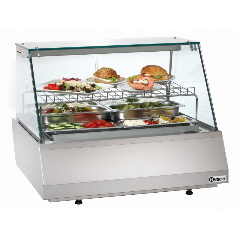 voorzien van rechthoekige voorruit Warmhoudvitrines voorzien van extra rooster en verlichting, CNS 18/10. De vitrine heeft aan de bedieningszijde schuifdeuren. Geventileerde koeling Temperatuur: +6° tot +10° C Afmetingen: B 750 x D 775 x H 600 mm Vermogen: 0,43 kW / 230 V 50 Hz Levering zonder GN-containers! (Voor accessoires kijk bij Gastronorm containers)