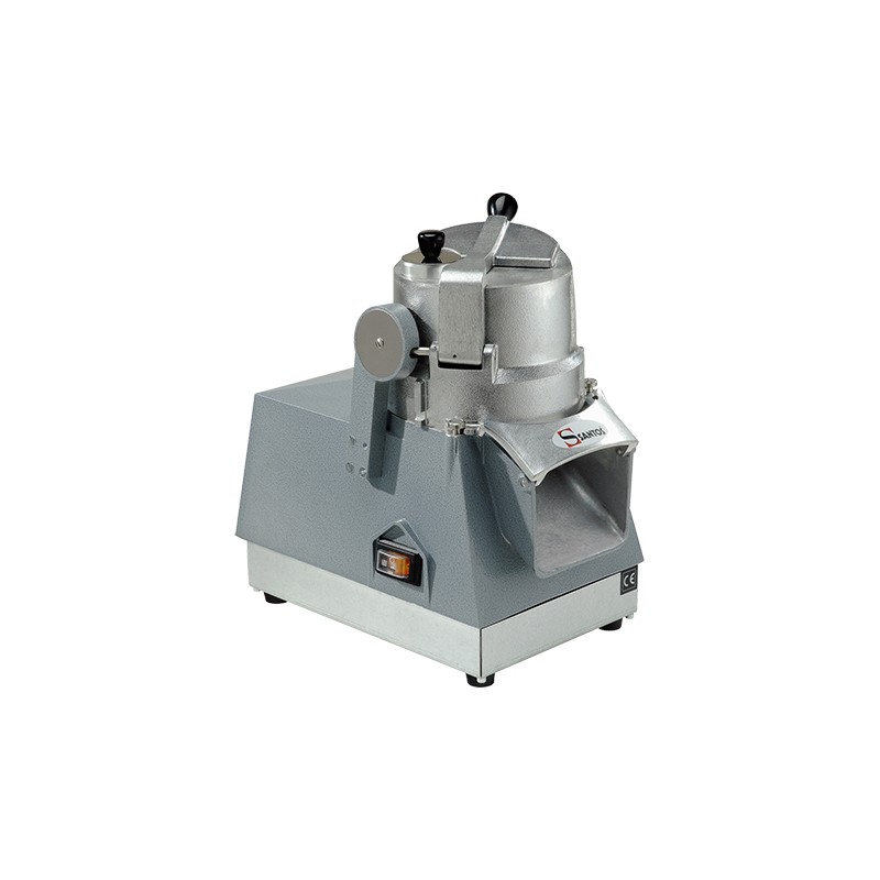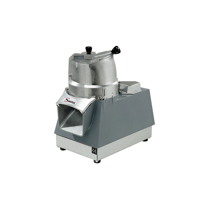 Snijdt plakjes, schijven en blokjes, en raspt noten, groente, kaas, etc. Vulopeningen en huis: roestvrije, hamerslag gemoffelde legering, speciale opening voor grotere stukken, rechte opening voor het snijden en raspen van langwerpige stukken. De schijven zijn van speciale roestvrije voedsel-veilige legering, geharde, roestvrijstalen messen, die schroefvormig snijden waardoor een spiegelglad snijoppervlak wordt verkregen, eenvoudige bajonetsluiting, schijven afzonderlijk verkrijgbaar. Capaciteit: ca. 250 kgp.u. gesneden aardappelen en groente, ca. 180 kgp.u. geraspt materiaal.