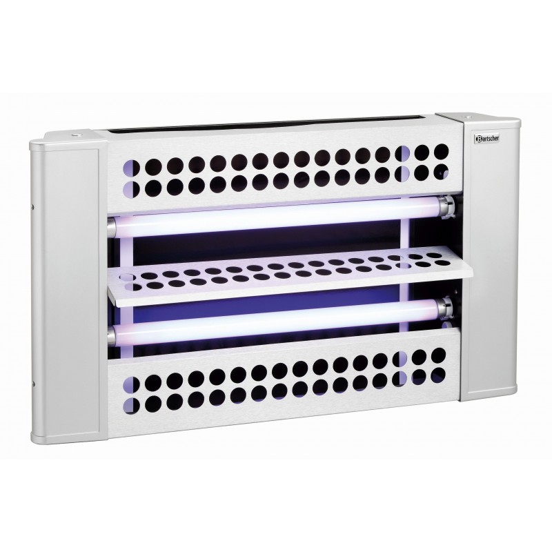 Behuizing van kunststof en aluminium 2 UV-A neonbuizen: 2 x 15 W Plakfolie: B 390 x H 313 mm Bereik: 10 m Vermogen: 30 W / 230 V 50/60 Hz Afmetingen: B 620 x D 90 x H 355 mm Inclusief 2 vellen plakfolie, bevestigingsmateriaal