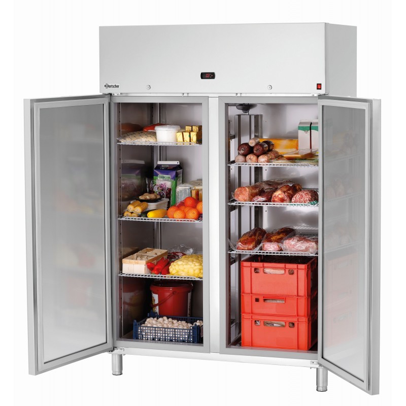 CNS 18/10 Luchtgekoeld Isolatie: polyurethaan, 60 mm dik Verstelbare roosters In hoogte verstelbare poten, afsluitbaar Afsluitbaar Automatische ontdooiing Dooiwaterverdamping Thermostaat Aan- / uitschakelaar Controlelampje Voor omgevingstemperatuur van 32 °C Bruto-inhoud: 1400 liter Temperatuurbereik: -2 °C tot 8° C Energieklasse F (EU) Nr 2015 /1094 Energieverbruik: 1862 kWh/Jaar Vermogen: 0,575 kW / 2230 V 50/60 Hz Afmetingen: B 1320 x D 855 x H 2050 mm Levering inclusief 6 roosters