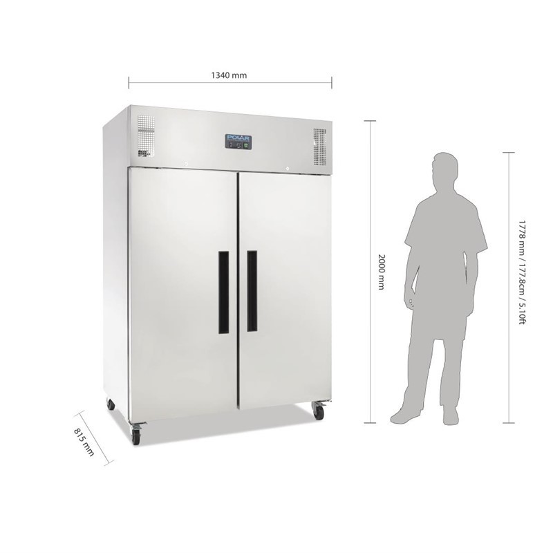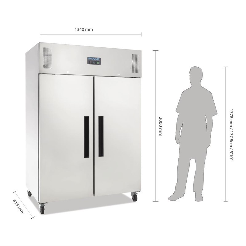 | Overige Kenmerken | GN 2/1 interieur, Afsluitbare, zelfsluitende deuren, Wielen (voorste geremd), 6 verstelbare schappen en 2 bodemroosters, Eenvoudige bediening met digitaal display, Geventileerde statische koeling, Max. omgevingstemperatuur: 32°C, Instelbare ontdooiing met |