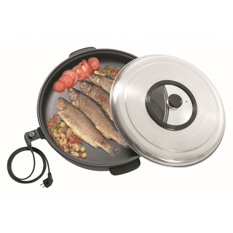 Anti-aanbaklaag Doorsnee buitenmaat: 55 cm Doorsnee binnenmaat: 51,5 cm Totale hoogte: 18 cm Binnenpanhoogte: 5 cm / ca. 10 liter Vermogen: 1,6 kW / 230 V 50 Hz Inclusief RVS-deksel met glazen kijkvenster
