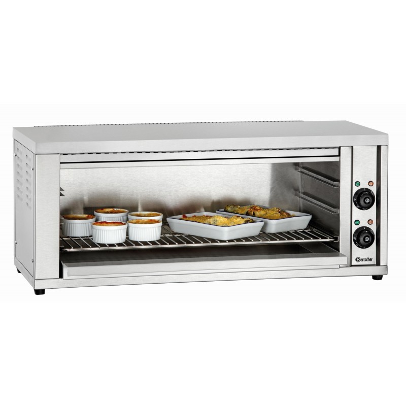 2 verwarmingszones CNS Controlelampjes Grillrooster met kantelbeveiliging, B 710 x D 345 mm Vetopvangschaal Vermogen: 4,4 kW 3/N/PE AC 400 V 50 Hz Afmetingen: B 910 x D 370 x H 385 mm Inclusief: 2 grepen voor eenvoudig uitnemen van het rooster