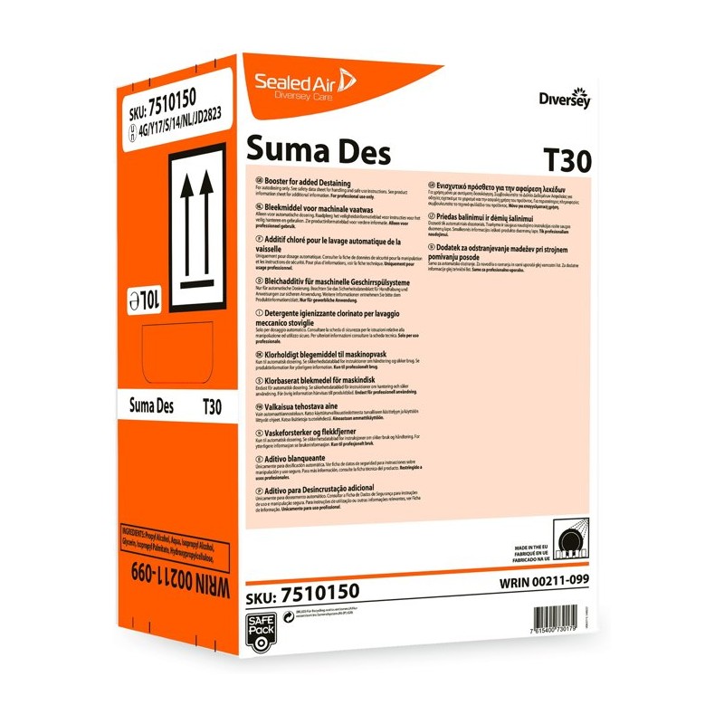 Suma Des T30 is een mild alkalisch bleekmiddel op basis van hypochloriet. Het is bedoeld voor gebruik in grotere meertanksmachines in combinatie met het vaatwasmiddel Suma Forte Plus L54. Deze combinatie van twee componenten geeft een uitstekend resultaat op de verwijdering van zetmeel, vetten en alle soorten vlekvorming. Suma Des T30 bevat bovendien ingrediënten waardoor het product uiterst veilig is voor roestvast staal, zelfs in onverdunde vorm.