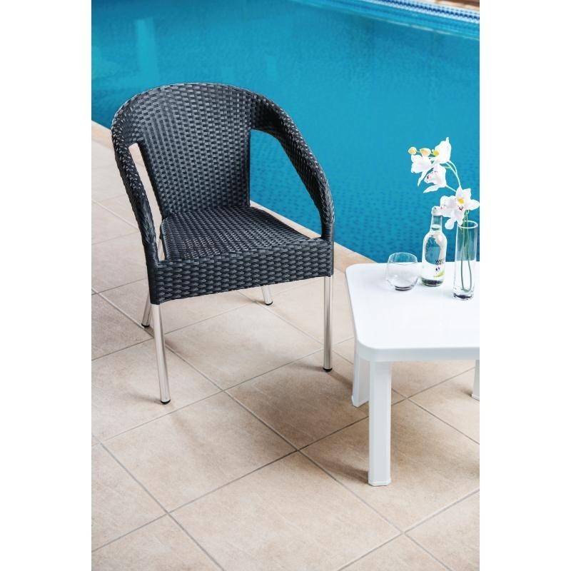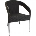 Aluminium frame. Kunststof rotan zitting. Zithoogte: 45cm. Stapelbaar. 4 stuks.Ontvanger :