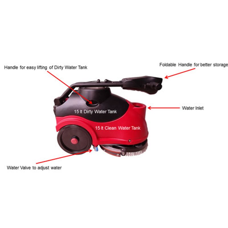 Gebruikersvriendelijke draadloze schrobzuigmachine die perfect is voor het schoonmaken van krappe ruimten.