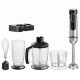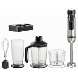 ... variabel inzetbaar voor mixen, pureren, fijn snijden, kloppen en roeren. Praktisch en eenvoudig omsteekbaar voor de verschillende functies. Ergonomisch design in edelstaal Aan/Uit schakelaar 5 snelheden, toerental mixer: max. 17000 omw./min. Vermogen: 700 W / 230 V 50 Hz Lengte mixstaaf : 207 mm Totaal lengte: 410 mm Accessoire-set bestaande uit: 1 garde 1 reservoir (800 ml) 2 speciaal reservoir met sikkelmessen (500 ml + 1250 ml) 1 passend deksel, geschikt voor beide speciale reservoirs 2 antislip onderleggers 1 wandhouder eenvoudig en snel reinigen van de accessoires