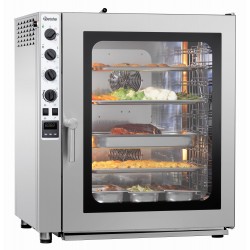 Uitvoering geheel in CNS Draaiknoppen Volume tot max. 10 x 1/1 GN of 600 x 400 mm Functies: hetelucht, stomen, combi-stomen Wisselende motorrichting (rechts-/linksom draaiend) voor een optimaal limaat in de gaarruimte Ventilatorsnelheid in 2 standen regelbaar Rechtstreekse stoominjectie Stoomafvoer regelbaar Ovenruimteverlichting Praktische GN-dwarsslede LED-indicaties voor kerntemperatuur Voorbereid voor plaatsing van een kerntemperatuurmeter Voorbereid voor de houder voor handsproeier Dubbele deurbeglazing, binnendeur voor reiniging gemakkelijk te openen Uitneembare geleiders Roosterafstand 74 mm Temperatuurbereik: 50 °C tot 280 °C Wateraanvoer 3/4" Vermogen: 12,6 kW / 400 V 50 Hz 3 NAC Afmetingen: B 890 x D 815 x H 1015 mm Levering inclusief: 1 rooster 1/1 GN en 1 bakblik 1/1 GN