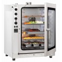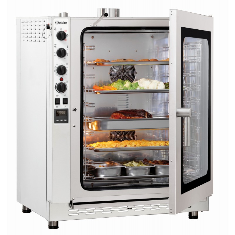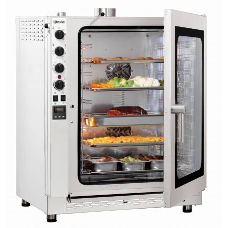 Uitvoering geheel in CNS Draaiknoppen Volume tot max. 10 x 1/1 GN of 600 x 400 mm Functies: hetelucht, stomen, combi-stomen Wisselende motorrichting (rechts-/linksom draaiend) voor een optimaal klimaat in de gaarruimte Ventilatorsnelheid in 2 standen regelbaar Rechtstreekse stoominjectie Stoomafvoer regelbaar Ovenruimteverlichting Praktische GN-dwarsslede LED-indicaties voor kerntemperatuur Voorbereid voor plaatsing van een kerntemperatuurmeter Voorbereid voor de houder voor handsproeier Dubbele deurbeglazing, binnendeur voor reiniging gemakkelijk te openen Uitneembare geleiders Roosterafstand 74 mm Temperatuurbereik: 50 °C tot 280 °C Wateraanvoer 3/4" Elektrisch vermogen: 0,8 kW / 230 V 50 Hz 1 NAC Gas vermogen: R 1/2" 19 kW Afmetingen: B 890 x D 850 x H 1135 mm Levering inclusief: 1 rooster 1/1 GN en 1 bakblik 1/1 GN