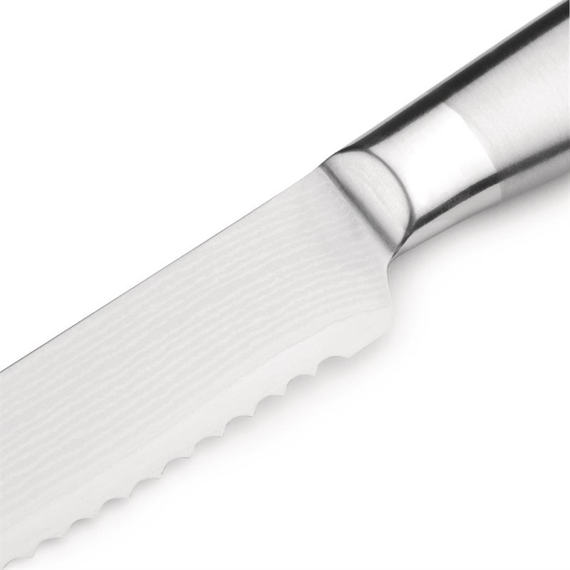 | Overige Kenmerken | Zeer scherp, met meerdere lagen RVS, Twee lagen damaststaal bedekken de kern, voor langdurige scherpte en een mooie finish, Damaststaal staal zorgt er ook voor dat voedsel minder blijft plakken aan het lemmet, De stalen kern in het lemmet is gehard tot ee |